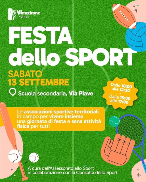 Sabato 13 Settembre 2025 si è tenuta la festa dello Sport di Vimodrone, un evento dedicato agli sport e alle associazioni locali offrendo un programma ricco di attività tra cui esibizioni sportive.